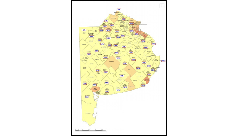 En ese sentido, el partido con mayores incrementos en la tasa fue Coronel Suárez con el 90%, seguido por Alberti, con el 83%; Saladillo, con 78%; Trenque Lauquen, con 75% y Villarino, con 74%, entre otros, incluidos en el primer segmento.