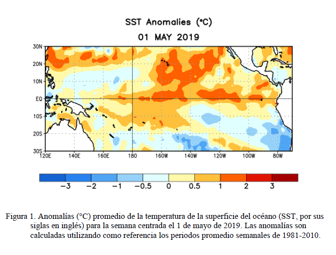 Se espera que El Niño continúe durante el invierno 2019 en el hemisferio sur y durante el verano del hemisferio norte (70% de probabilidad). Durante el mes de abril, las temperaturas persistieron sobre lo normal en la superficie del mar (SSTs, por sus siglas en inglés) a través de la mayor parte del Océano Pacífico