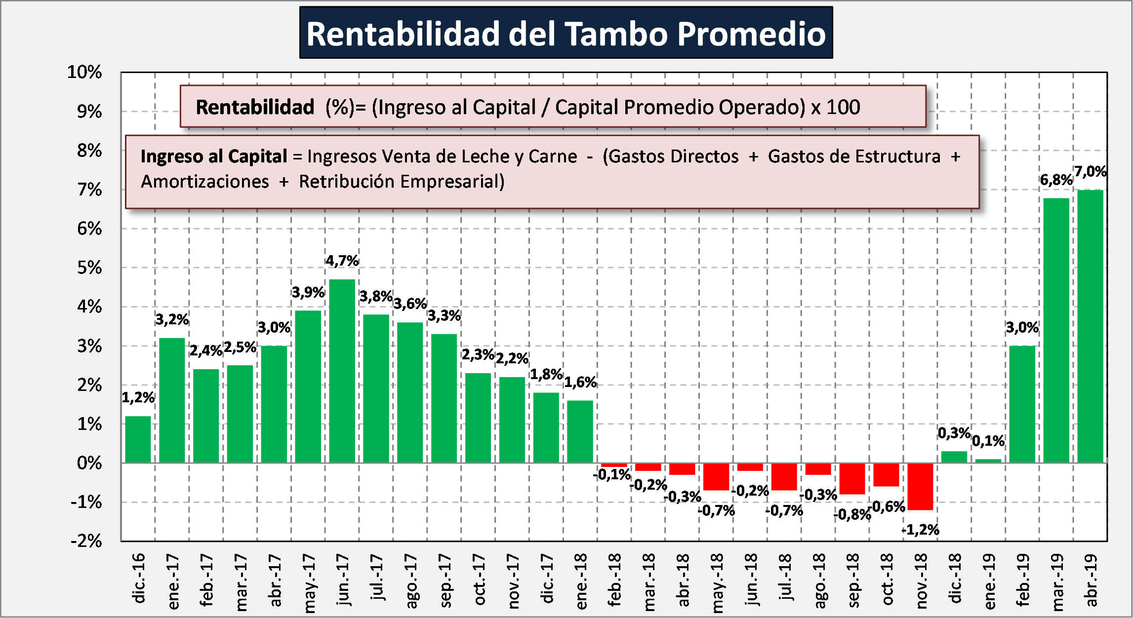 En tanto, el precio pagado al productor se recuperó un 13%, respecto al mes anterior y acumula un aumento del 118% interanual, en abril se pagó 13.32$/litro y es el quinto mes consecutivo que los tambos tienen una rentabilidad positiva.
