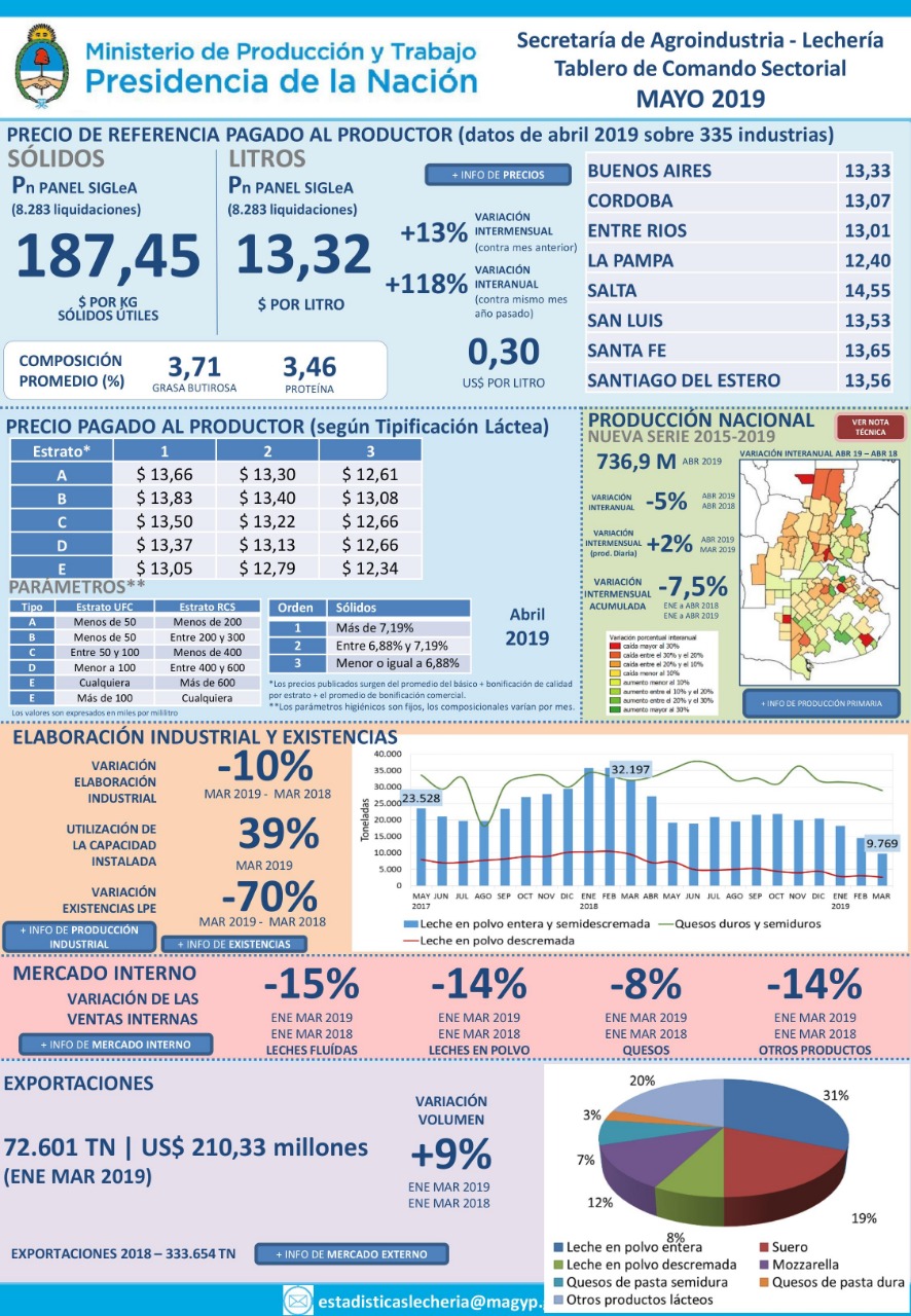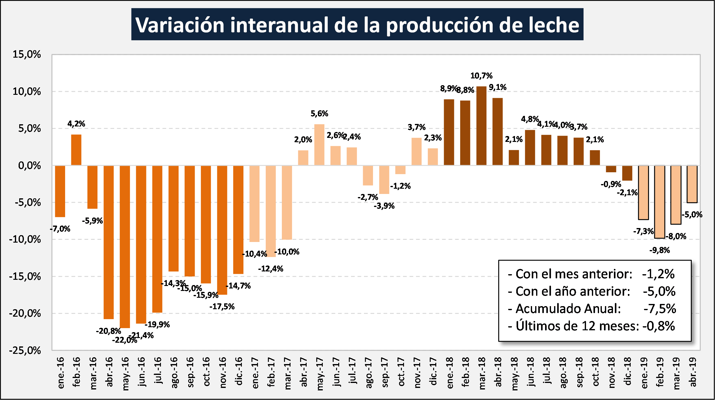 En el mes de abril de 2019 la producción fue de 736,9 millones de litros de leche, este valor representa un baja del 1,2% respecto al mes anterior y una caída del 5,0% en comparación con igual mes del año anterior. En tanto, el consumo de lácteos se retrajo 15% para la leche fluida, 14% para leche en polvo, 8% los quesos y 14% el resto de los productos lácteos.