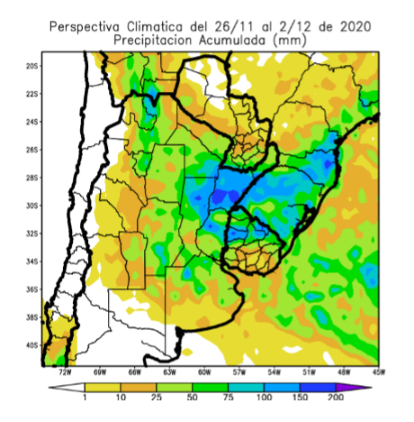 Para el caso del oeste del NOA, la mayor parte de Cuyo, el sur de la Región Pampeana y la mayor parte del Paraguay se observarán precipitaciones escasas (menos de 10 mm), con focos con valores inferiores.