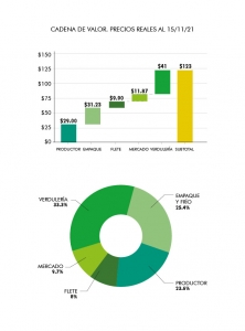 Los analistas estimaron, a partir de ese precio final, que el productor hace un aporte al valor de la fruta del 23.6% (29 pesos), que el empaque aporta un 25.4% (31.23 pesos), que el flete sumó un 8% (9.90 pesos), que el mercado concentrador la encareció otro 9.7% (11.87 pesos) y que la verdulería, el punto final, se quedó con 33.3% (41 pesos) del precio final.