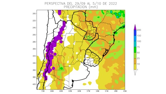 - La mayor parte del área agrícola argentina y gran parte del área agrícola uruguaya recibirán precipitaciones escasas (menos de 10 milímetros) con focos con valores moderados.